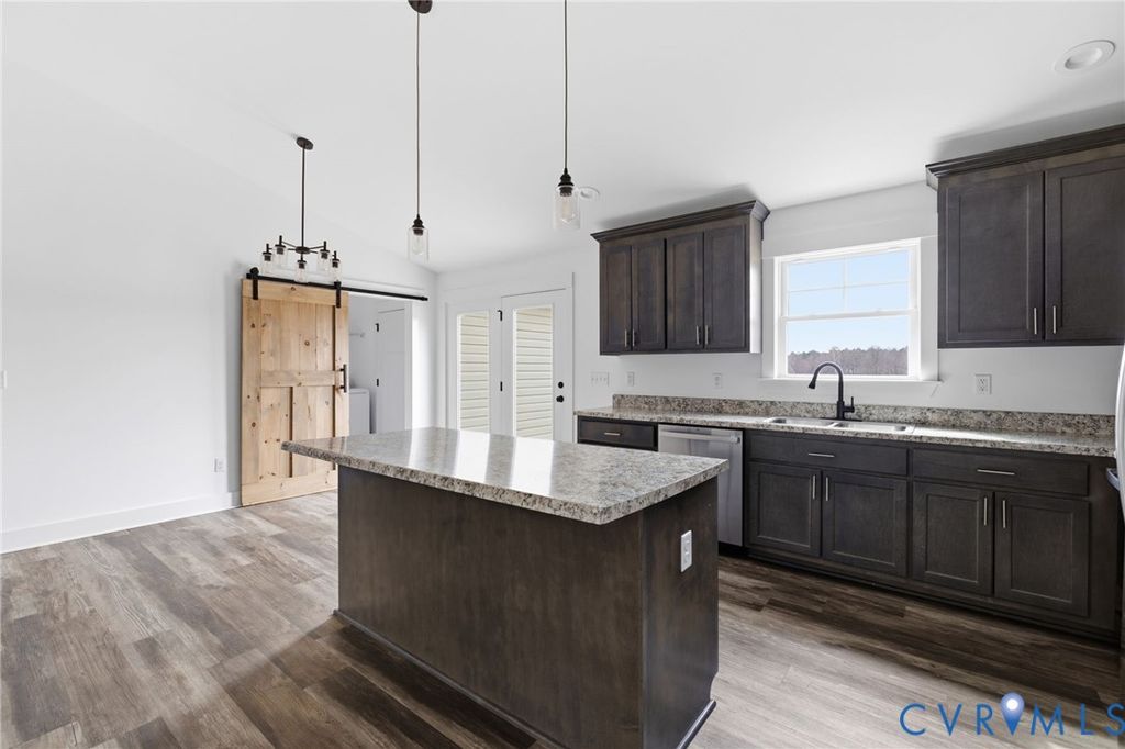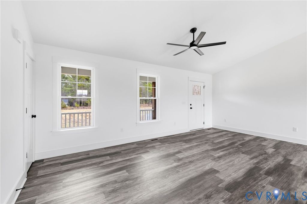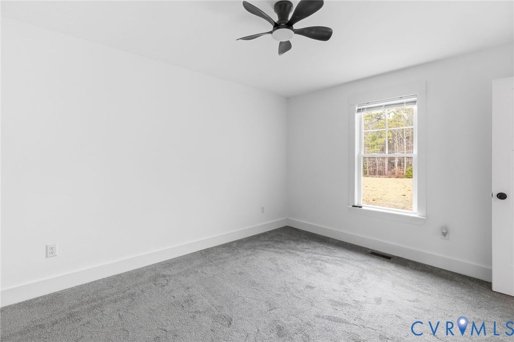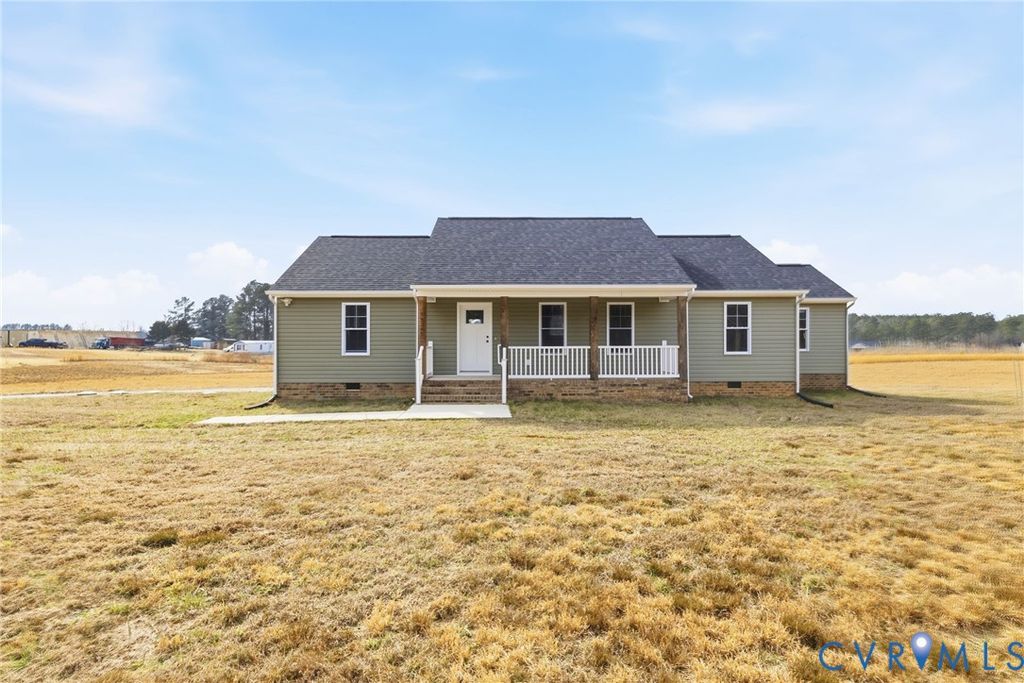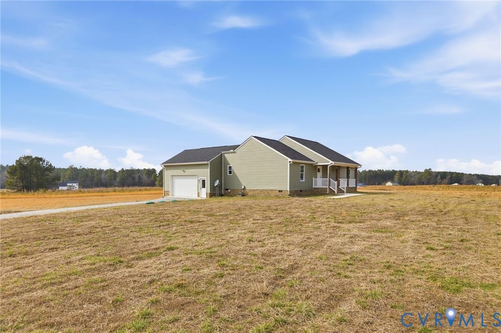 Welcome to peaceful country living in sought-after Prince George County! Nestled on 5 beautiful acres, this charming ranch-style home offers 4 bedrooms, 2 baths, and 1,716 sqft. of comfortable, modern living space. A full front porch warmly welcomes you inside to an open and airy floor plan. The spacious family room features LVP flooring, vaulted ceilings, a ceiling fan, and an abundance of natural light, creating the perfect gathering space for relaxing or entertaining. The gourmet kitchen is both stylish and functional, complete with a large center island with bar seating, stainless steel appliances, a pantry, and recessed lighting. An adjacent dining area flows seamlessly to the outdoors, with a sleek modern glass-paneled door leading to the rear deck. A rustic sliding barn door adds character while providing access to the convenient laundry room. The spacious primary suite is a true retreat, featuring a large walk-in closet and a beautifully appointed en suite bath with dual vanities, LVP flooring, a freestanding tub, and a walk-in shower. Three additional bedrooms offer plush carpet and oversized closets, providing plenty of space for family or guests. A shared hall bath includes a large vanity and a tub/shower combo. Step outside to enjoy the expansive rear deck overlooking your private, sprawling backyard, perfect for entertaining, gardening, or simply soaking in the peaceful surroundings. With plenty of space both inside and out, this property offers the ideal blend of modern comfort and country charm, don't miss your chance to make it yours!