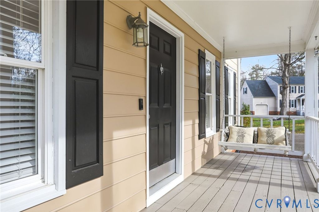 Located on a serene cul-de-sac-lot, come relax on the inviting country front porch of this recently updated 4 bedroom, 2 1/2 bath, 1 car garage home that is ready for you. Features: 30-year replacement roof, Replacement windows, Repainted interior, Complete Kitchen remodel with all stainless appliances, Up-dated Kitchen & Family room flooring, Up-dated carpeting on stairway & 2nd floor, Plantation blinds throughout and Insulated and finished Garage. Located in the award-winning community of Brandermill, as a resident you have access to endless amenities: 15 miles of walking trails, community pools, playgrounds, Kayaking and fishing on the 1700-acre Swift Creek Reservoir and more. The private Brandermill Golf and Tennis Club is nearby. The home is conveniently located near the Powhite Parkway and route 288 interchange, allowing for convenient travel and commuting in all directions. Local shopping, restaurants, and entertainment are mere minutes away. Don't miss this opportunity to enjoy living in this resort-style community.