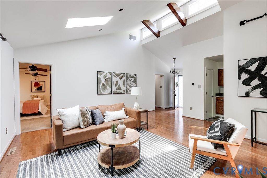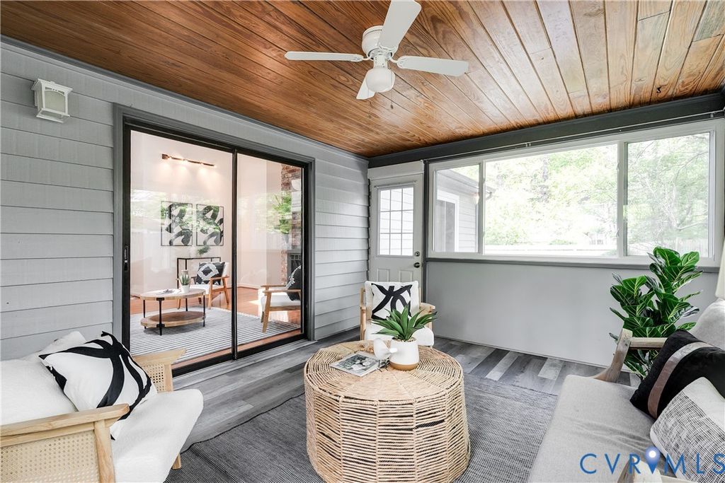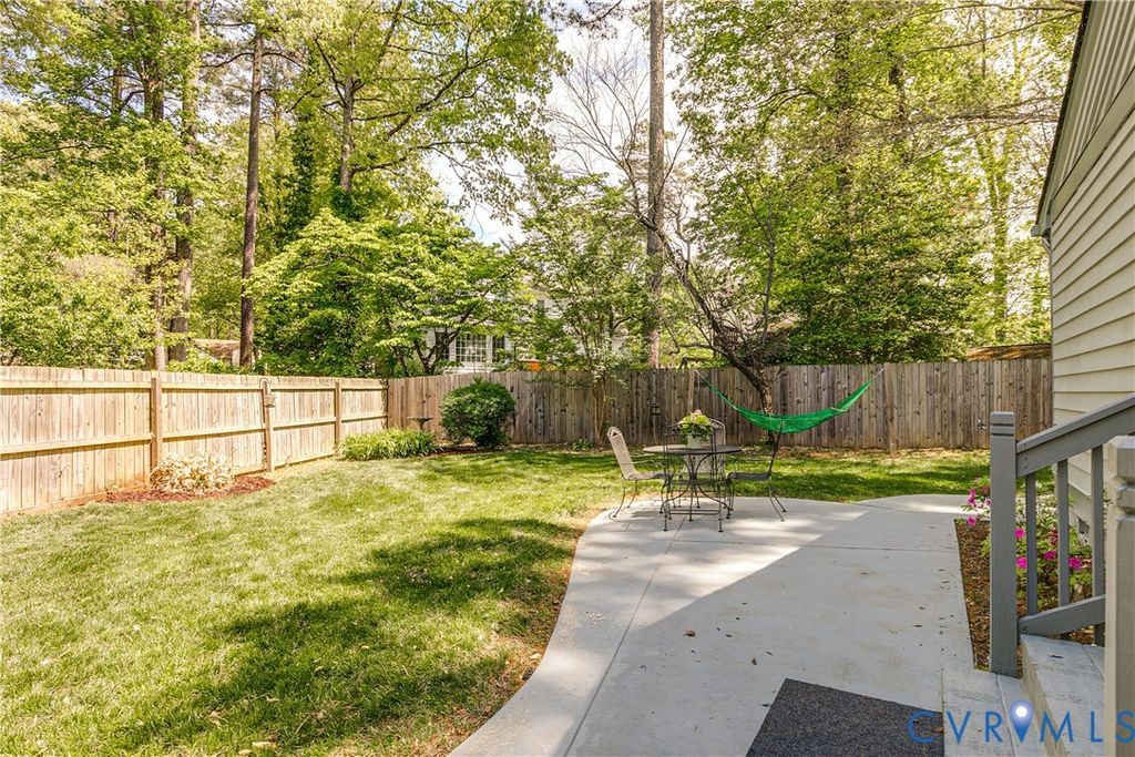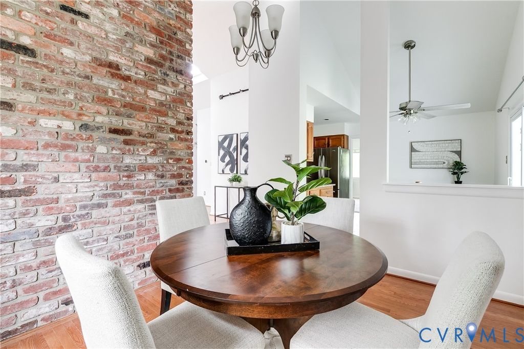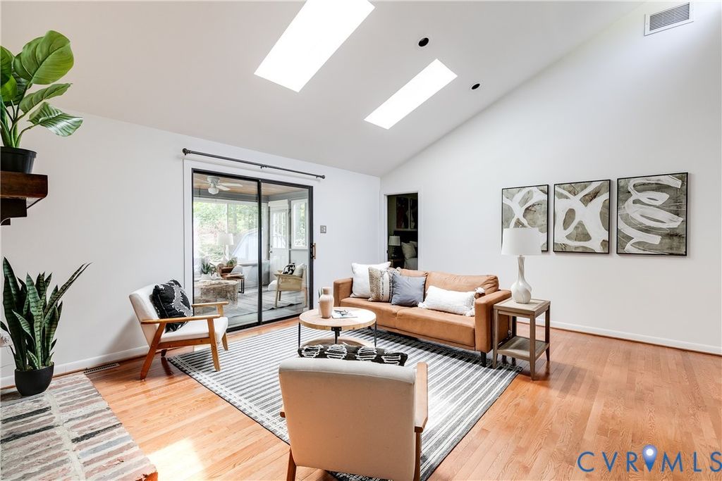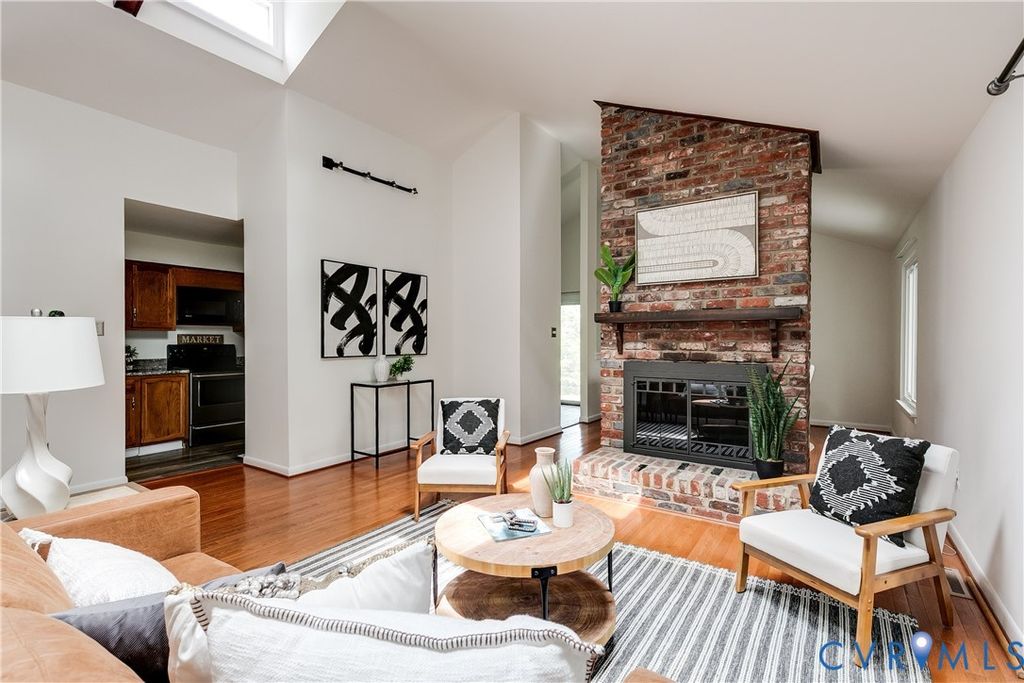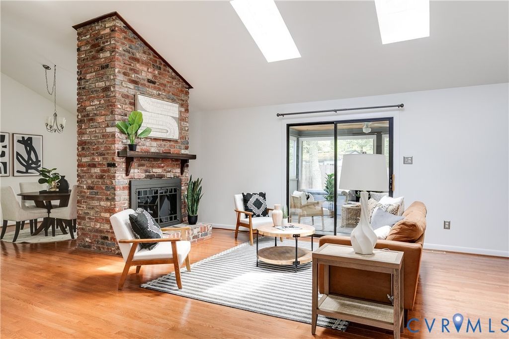 Tucked away on a quiet cul-de-sac in the desirable Smoketree neighborhood of North Chesterfield, this striking contemporary home blends warmth, character, and thoughtful updates throughout. The exterior's natural cedar siding sets the tone, while inside you're greeted by a light-filled living space featuring soaring ceilings, exposed wood beams, and stunning skylights that flood the home with natural light. At the heart of the home is a truly unique, 360-degree exposed brick fireplace, creating a dramatic centerpiece that seamlessly connects the living room and dining area, perfect for both everyday living and entertaining. The kitchen has been updated with granite countertops and vinyl plank flooring, Throughout the home, you'll find hardwood floors (installed in 2016), along with brand new carpet in one of the bedrooms. The primary bedroom features an en-suite bathroom and spacious walk-in closet. Major system updates provide peace of mind, including a new HVAC system (2025), roof (2022), and water heater (2021) and a new garbage disposal has also been installed. The home is also wired for an alarm system. Enjoy additional living space with the enclosed porch (2020), ideal for relaxing year-round. Outside, the generous yard wraps around the home, offering a great balance of open space and privacy, surrounded by mature trees and attractive natural foliage. The yard features two storage sheds and a concrete slab in the backyard, ideal for the included basketball hoop or can be easily repurposed for a fire pit with seating. For those who enjoy outdoor lounging, the hammock itself does not convey, but the cemented wood posts will remain, ready for the next owner to add their own setup. A driveway addition completed in 2023 adds convenience and extra parking. With its distinctive architectural features, modern updates, peaceful cul-de-sac setting, and inviting outdoor space, this Smoketree gem offers a rare blend of style and functionality you won't want to miss.