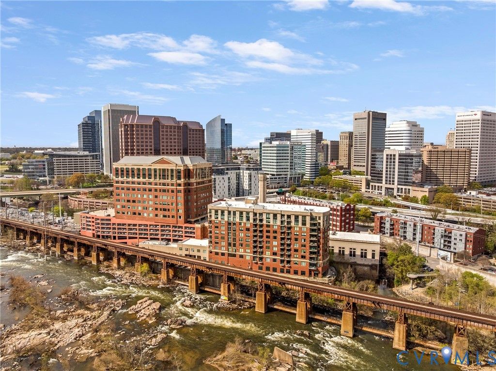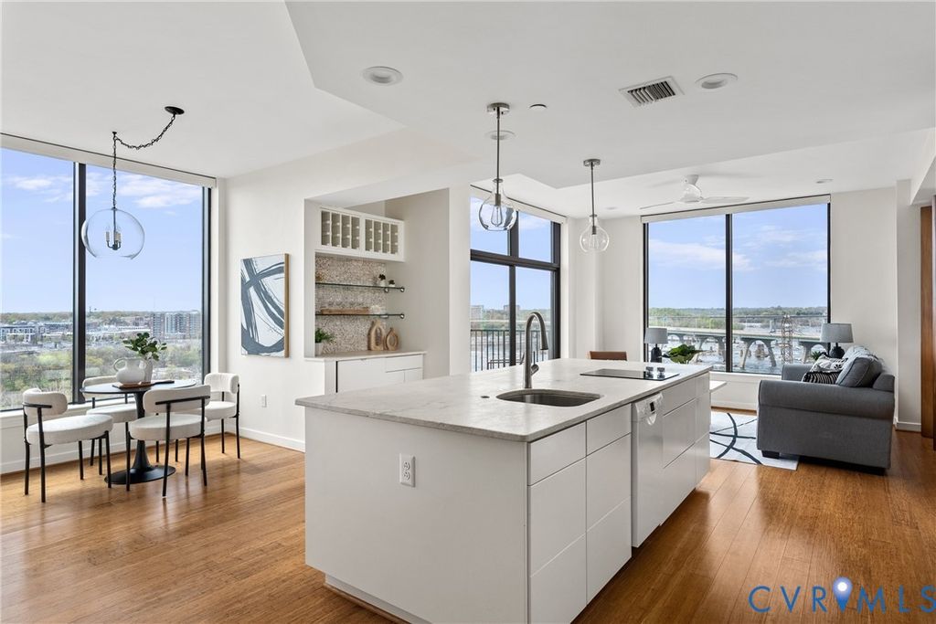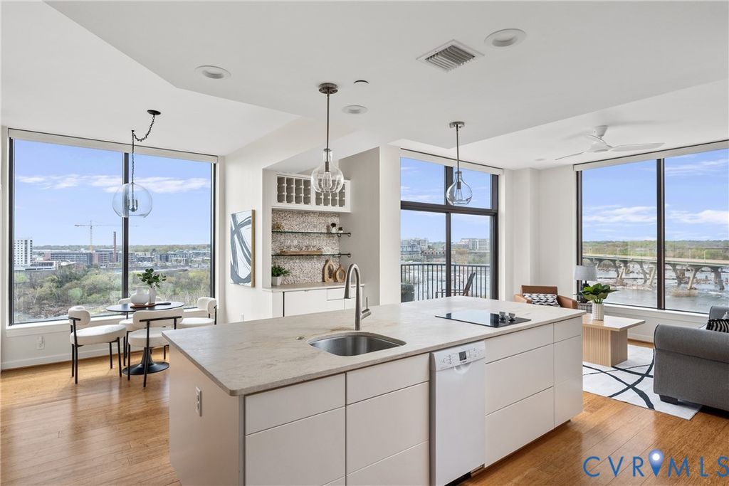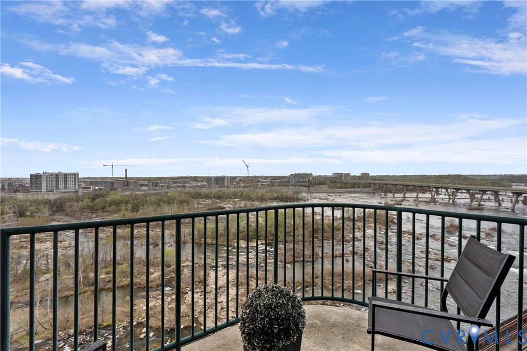 Introducing the crown jewel of Riverside on the James"”an exceptional penthouse residence offering some of the most commanding views in the entire building. From this top-floor vantage point, the James River unfolds in a breathtaking panorama, where sunsets paint the sky and even the occasional bald eagle becomes part of your daily backdrop. This two-bedroom, two-bath home has been completely reimagined and renovated through a thoughtful collaboration between VMAX Custom Homes and Circle Design Studio, resulting in a space that feels both architecturally intentional and effortlessly livable. Featured in Richmond Magazine, the residence stands as a showcase of modern design and elevated craftsmanship. At the heart of the home, the kitchen makes a striking impression. A massive island anchored by leathered quartz countertops creates a bold focal point, complemented by sleek flat-panel cabinetry and a suite of integrated Bosch appliances. A dedicated wine or coffee bar adds a layer of refinement, making the space equally suited for entertaining or everyday ritual. The open-concept living area is framed by expansive windows that draw in natural light and uninterrupted river views, creating a seamless connection between indoors and out. Every detail has been curated to enhance both form and function, resulting in a space that feels as inspiring as it is comfortable. The primary suite, complete with a walk-in closet, and a spa-like en-suite bath featuring a double vanity and large glass shower. The second bedroom has been transformed into a sophisticated flex space, outfitted with custom bi-fold doors that allow it to adapt beautifully"”whether as a guest room, office, or extension of the main living area. A private fitness center, in-unit washer and dryer, and two assigned covered parking spaces add layers of everyday ease to Riverside living. This is a rare opportunity to own a truly one-of-a-kind penthouse"”where design, elevation, and views converge at the highest level.
