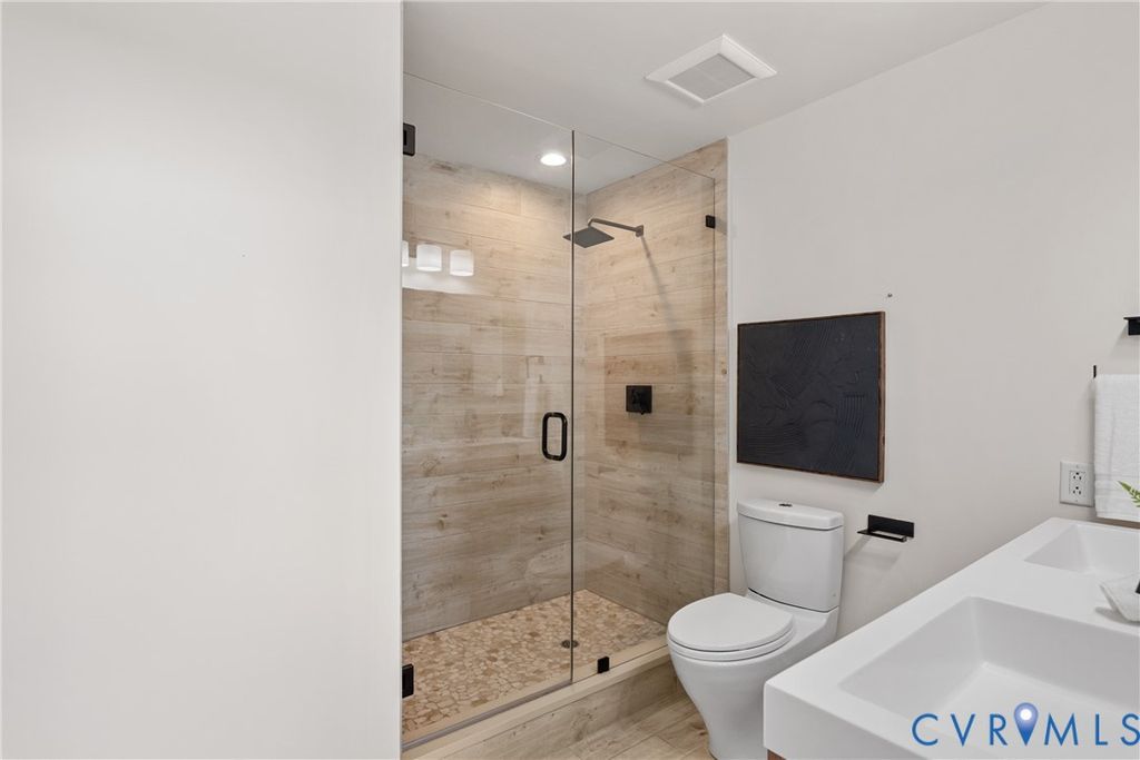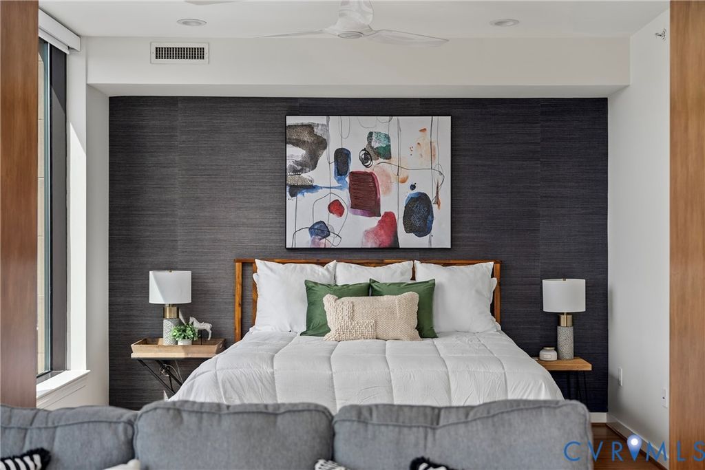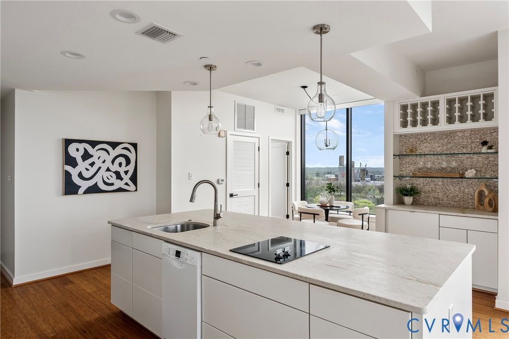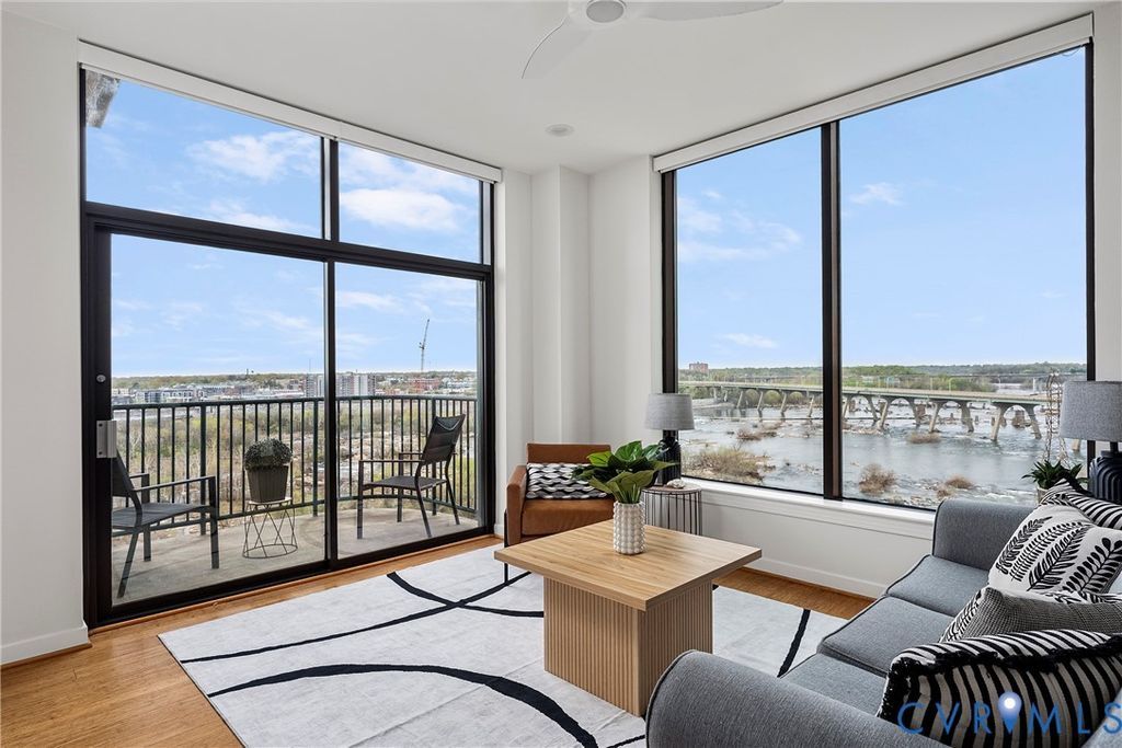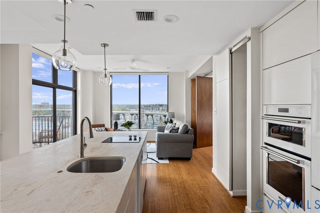 Introducing the crown jewel of Riverside on the James"”an exceptional penthouse residence offering some of the most commanding views in the entire building. From this top-floor vantage point, the James River unfolds in a breathtaking panorama, where sunsets paint the sky and even the occasional bald eagle becomes part of your daily backdrop. This two-bedroom, two-bath home has been completely reimagined and renovated through a thoughtful collaboration between VMAX Custom Homes and Circle Design Studio, resulting in a space that feels both architecturally intentional and effortlessly livable. Featured in Richmond Magazine, the residence stands as a showcase of modern design and elevated craftsmanship. At the heart of the home, the kitchen makes a striking impression. A massive island anchored by leathered quartz countertops creates a bold focal point, complemented by sleek flat-panel cabinetry and a suite of integrated Bosch appliances. A dedicated wine or coffee bar adds a layer of refinement, making the space equally suited for entertaining or everyday ritual. The open-concept living area is framed by expansive windows that draw in natural light and uninterrupted river views, creating a seamless connection between indoors and out. Every detail has been curated to enhance both form and function, resulting in a space that feels as inspiring as it is comfortable. The primary suite, complete with a walk-in closet, and a spa-like en-suite bath featuring a double vanity and large glass shower. The second bedroom has been transformed into a sophisticated flex space, outfitted with custom bi-fold doors that allow it to adapt beautifully"”whether as a guest room, office, or extension of the main living area. A private fitness center, in-unit washer and dryer, and two assigned covered parking spaces add layers of everyday ease to Riverside living. This is a rare opportunity to own a truly one-of-a-kind penthouse"”where design, elevation, and views converge at the highest level.
