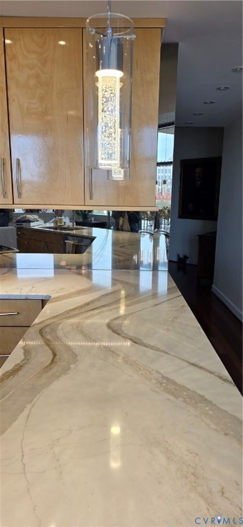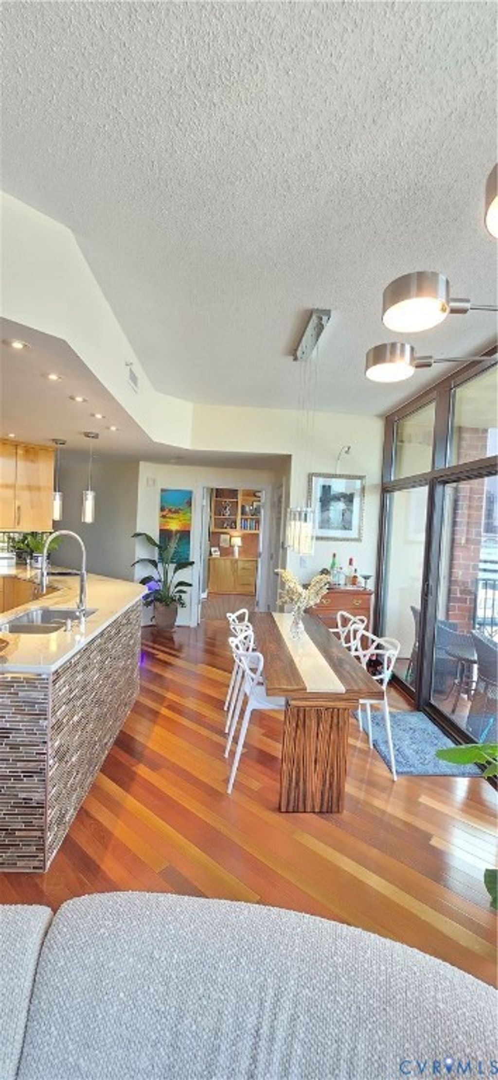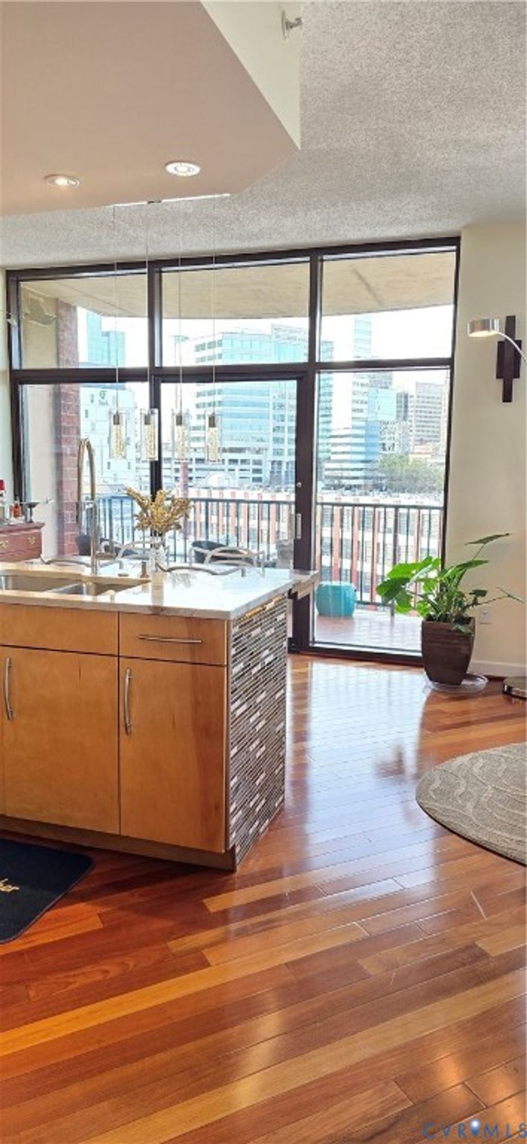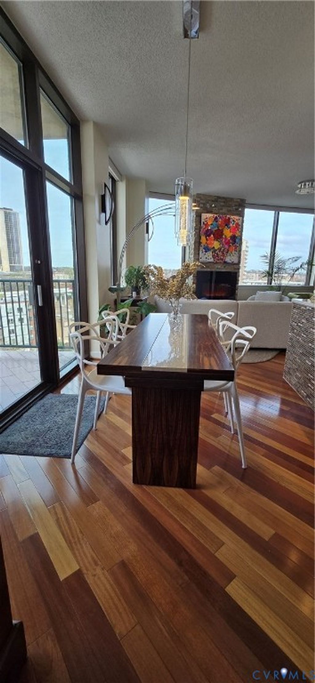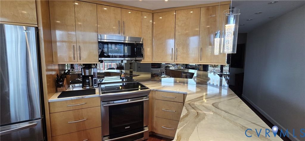 Welcome home to your renovated modern urban escape between the canal and river! Unit 815 has 2 BR, 2 Baths, 2 parking spaces and 2 storage units (one is double height). This unit has been delightfully updated with high end fixtures, wood floors and modern appliances, and a gorgeous feature stone fireplace and MannKidwell automatic blinds. But why cover the views of the downtown skyline, Church Hill and down the James River? Enjoy your kitchen updated with full peninsula, marble counters, solid wood cabinets, convection stove and oven, microwave and dishwasher. Principal BR has views downriver and walk in closet, and its ensuite bath has lovely tiled shower and counter, double designer sinks and a coveted extra large closet. Second BR has gorgeous solid wood built in desk and cabinets for dream home office, with space for bed or pull out sofa, and its own ensuite bath. New oversized stacked washer and dryer in large storage closet. Professional lighting throughout to display your artwork. Outdoor balcony to take in those amazing city views! Common amenities include secure covered parking, common room and kitchen available for use and updated workout and exercise facilities. First public offering since new. $539,000.