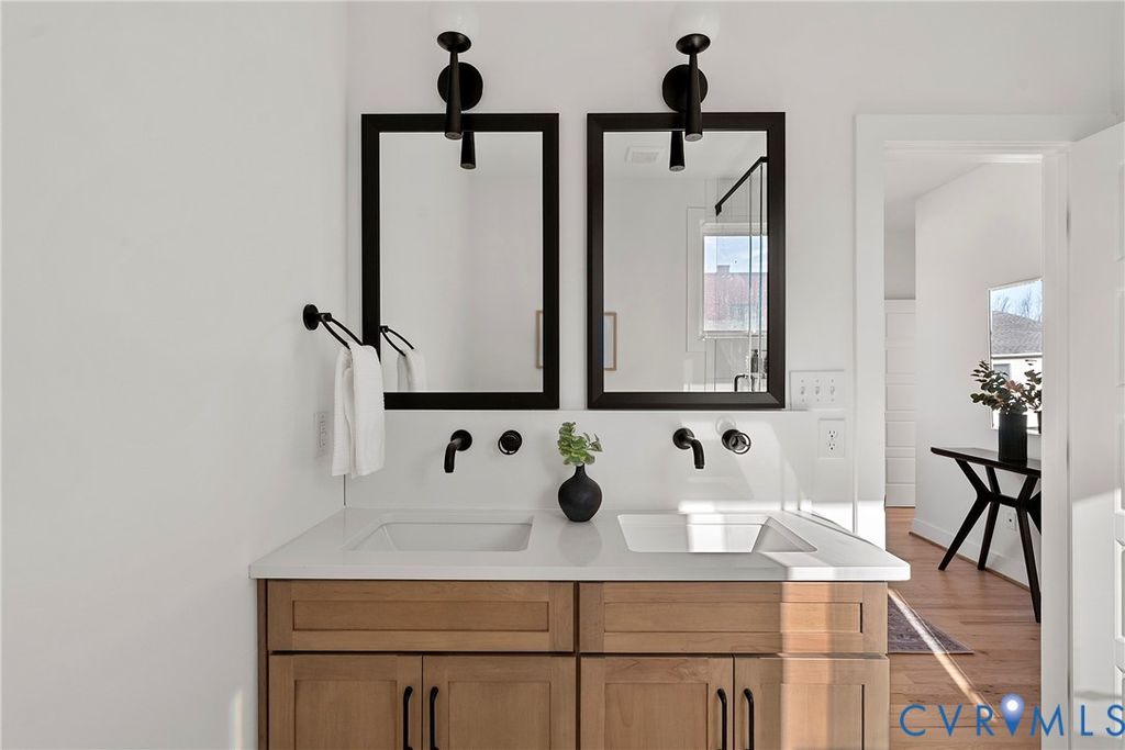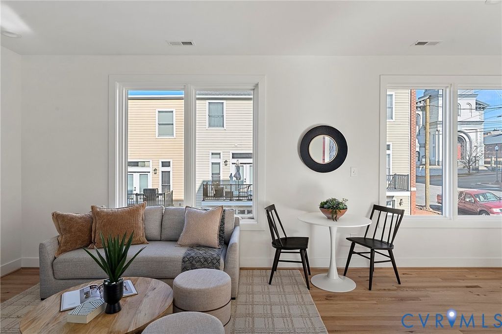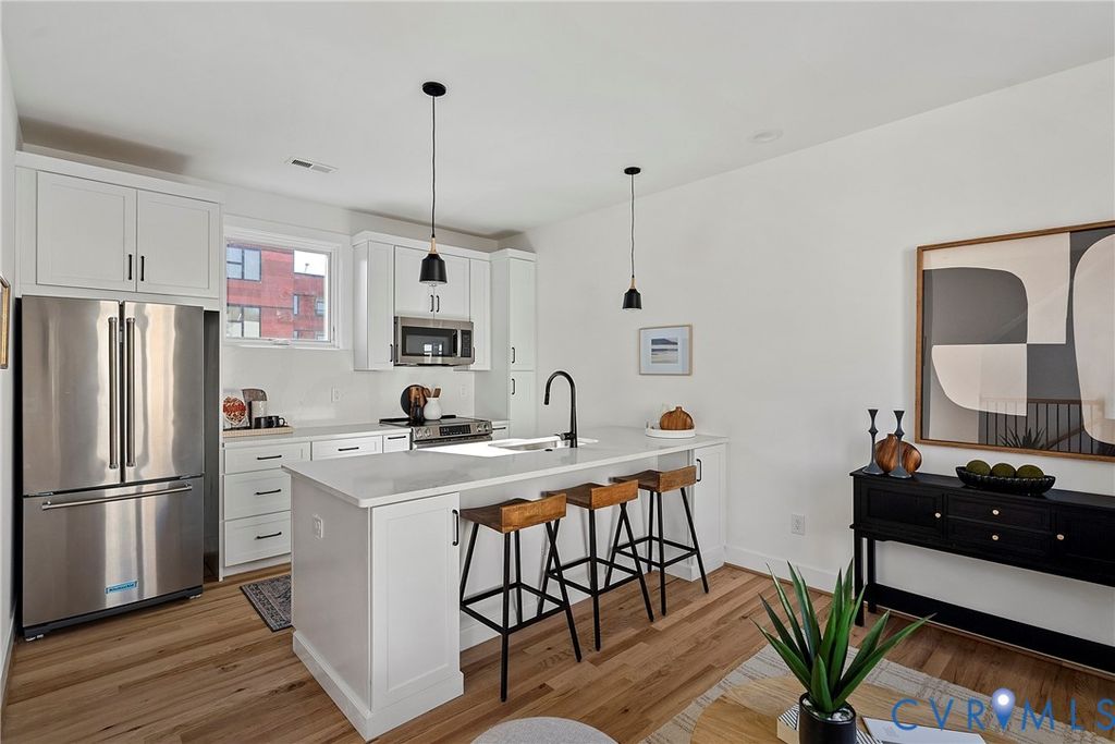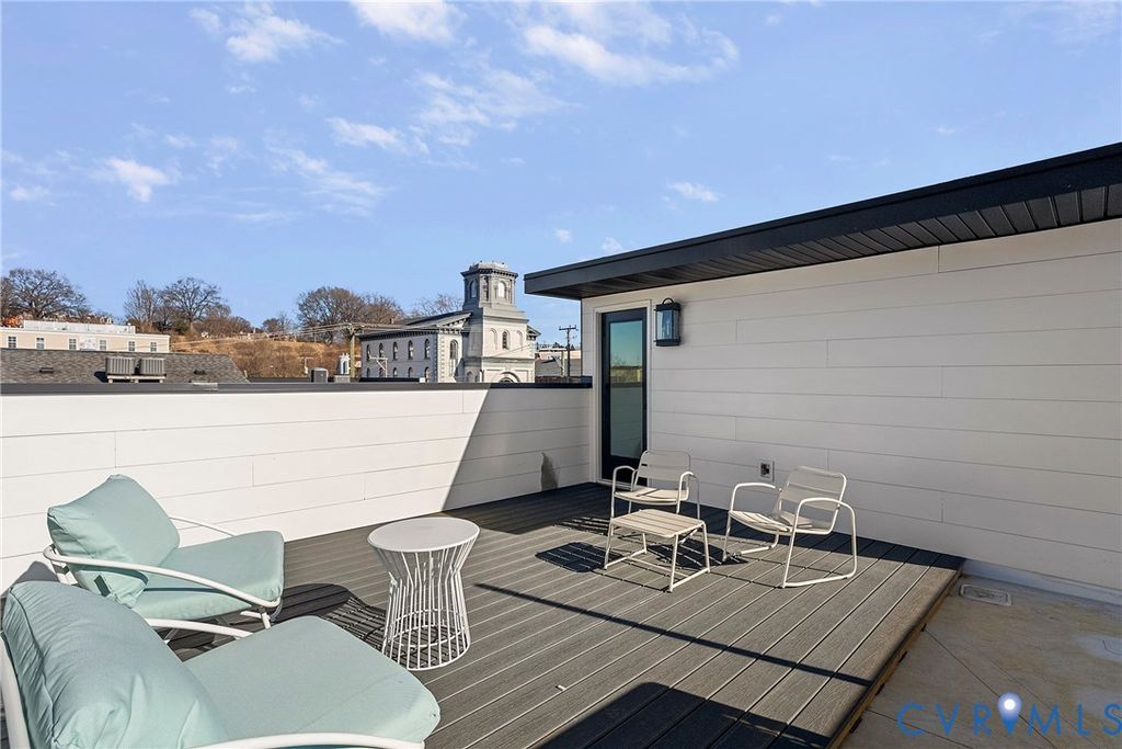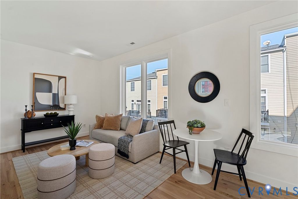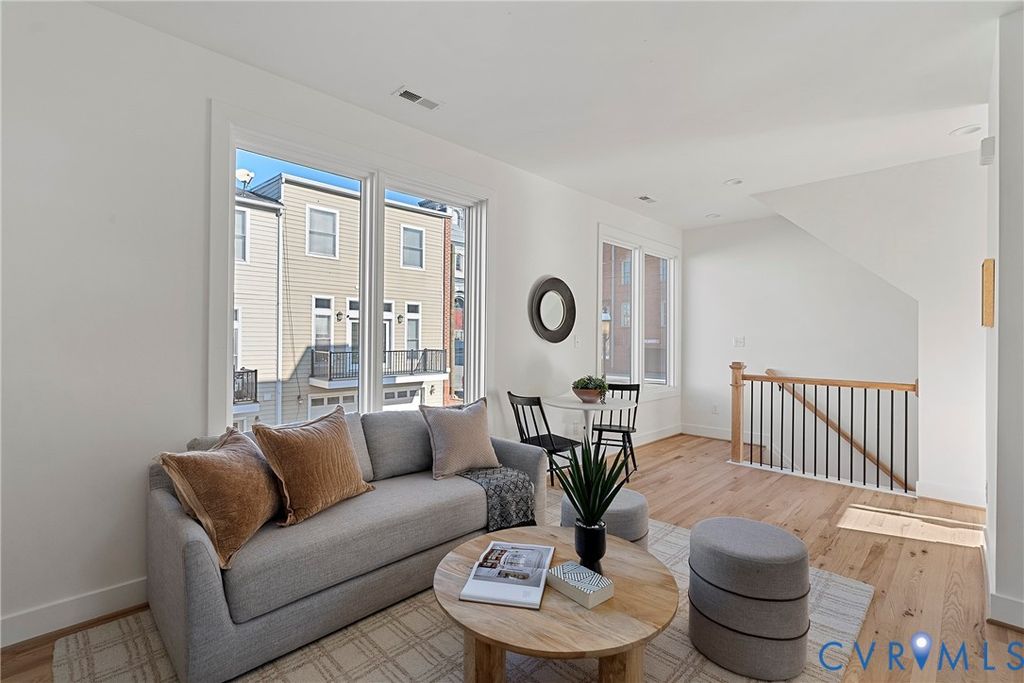 Nestled in historic Shockoe Bottom, just blocks from Ironclad Coffee, 17th Street Market, Havana 59, Main Street Station, and more, this sleek new-construction townhome offers the perfect blend of style and convenience"”all just steps from your front door. This thoughtfully designed home features 3 bedrooms, 2.5 baths, and 1,464 square feet of bright, open living space. Highlights include oversized casement windows, hardwood floors, abundant natural light, generous closet space throughout, and a private rooftop deck. The first level offers two spacious bedrooms, each with a ceiling fan and oversized closet. The hall bath features a large quartz-topped vanity, tile flooring, and a walk-in shower with frameless glass, tile to the ceiling, and a transom window for added natural light. The second level showcases an open great room with hardwood floors, recessed lighting, and a cozy den that flows seamlessly into the kitchen. The kitchen is beautifully appointed with quartz countertops and backsplash, white soft-close cabinetry, stainless steel appliances, and an oversized peninsula with bar seating"”ideal for casual dining and entertaining. Upstairs, the primary suite includes hardwood floors, a ceiling fan with overhead lighting, a spacious walk-in closet, and a spa-like en suite bath with tile flooring, a double vanity, and a frameless glass walk-in shower with a built-in niche. At the top, enjoy the private rooftop deck"”an impressive 12' x 19' southwest-facing patio offering beautiful sunset views and added privacy thanks to tall dividing walls between units. Come experience this exceptional home and everything Shockoe Bottom living has to offer