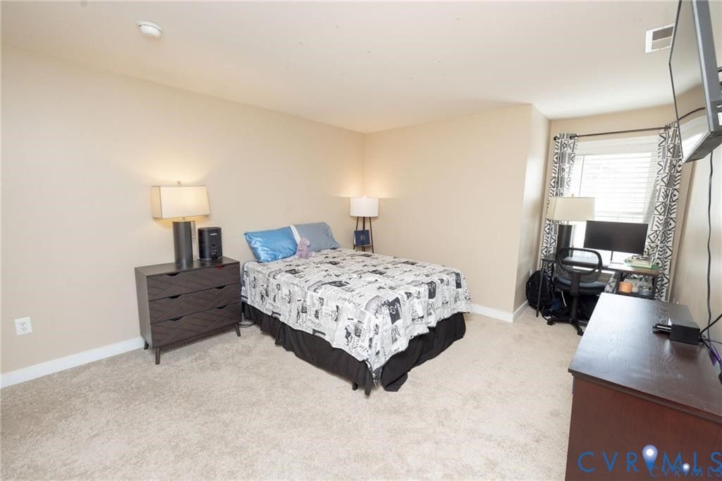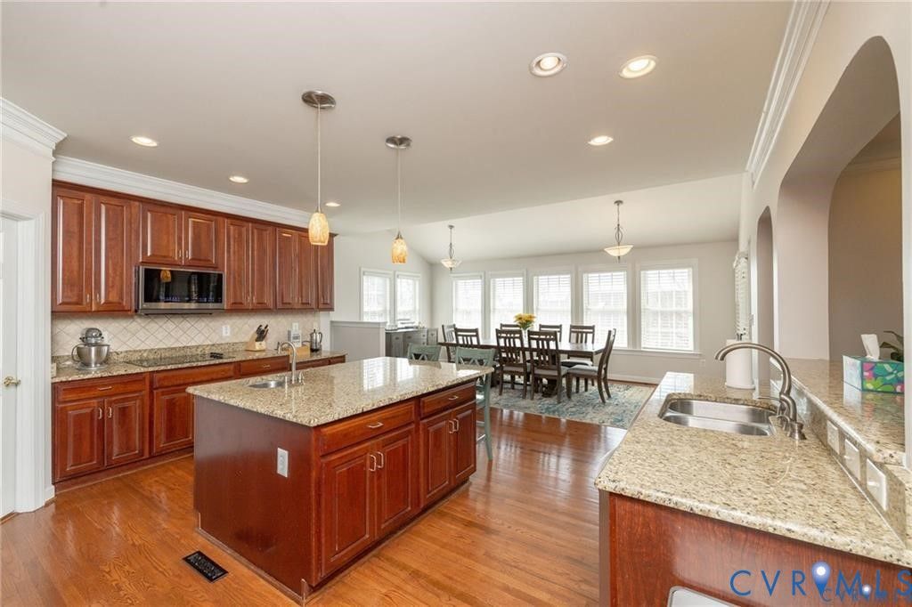 Welcome to 1118 Bach Ln in Hartley Village at Charter Colony, a 6 bedroom, 5 full bath transitional home with 4,458 sq ft of beautifully designed living space in one of Midlothian's most amenity-rich communities. Step inside the foyer with 9 ft ceilings, wood floors & decorative center staircase. To the right is a flexible sitting room/office with rounded entry, crown molding & custom blinds, while the formal dining room to the left features wood floors, bay window, tray ceiling, chair rail & detailed trim with access to the kitchen through a butler's pantry. The great room offers oversized windows, recessed lighting, built-ins & a gas fireplace with granite surround & wood mantle. The kitchen has wood floors, oversized island with seating, granite countertops, tile backsplash, stainless appliances, double wall ovens, cooktop, prep area, eat-at counter & study nook. The morning room has seven windows & double doors to the screened porch. The first floor also includes a bedroom with full bath & laundry with utility sink, built-in shelving, pantry storage & garage access. Upstairs, four bedrooms include a primary suite with tray ceiling, dual walk-in closets & spa-style bath with jetted tub, tiled shower, dual vanities & makeup area. The third floor provides a versatile loft, sixth bedroom & full bath perfect for guests or teens. Outside, the home has an aggregate double width driveway, brick front stoop with metal roof accents, dimensional roof, mature landscaping & trees. The fenced backyard features a screened porch overlooking stamped concrete patio, landscaped beds & crape myrtles. Charter Colony amenities include three clubhouses, multiple pools including a zero-entry pool with sundeck, pickleball & tennis courts, playgrounds, walking trails, pedestrian tunnels connecting villages & a community amphitheater. Don't miss your chance to own this exceptional home in Hartley Village at Charter Colony!