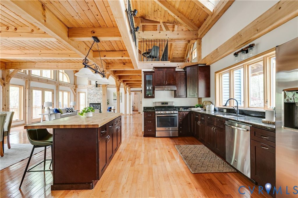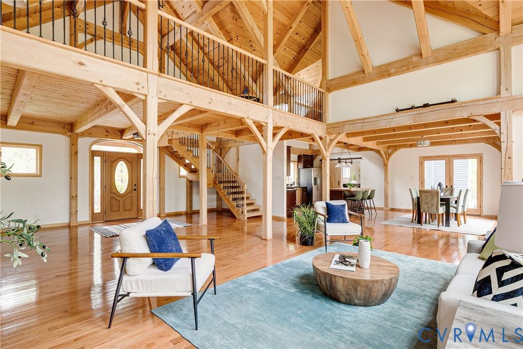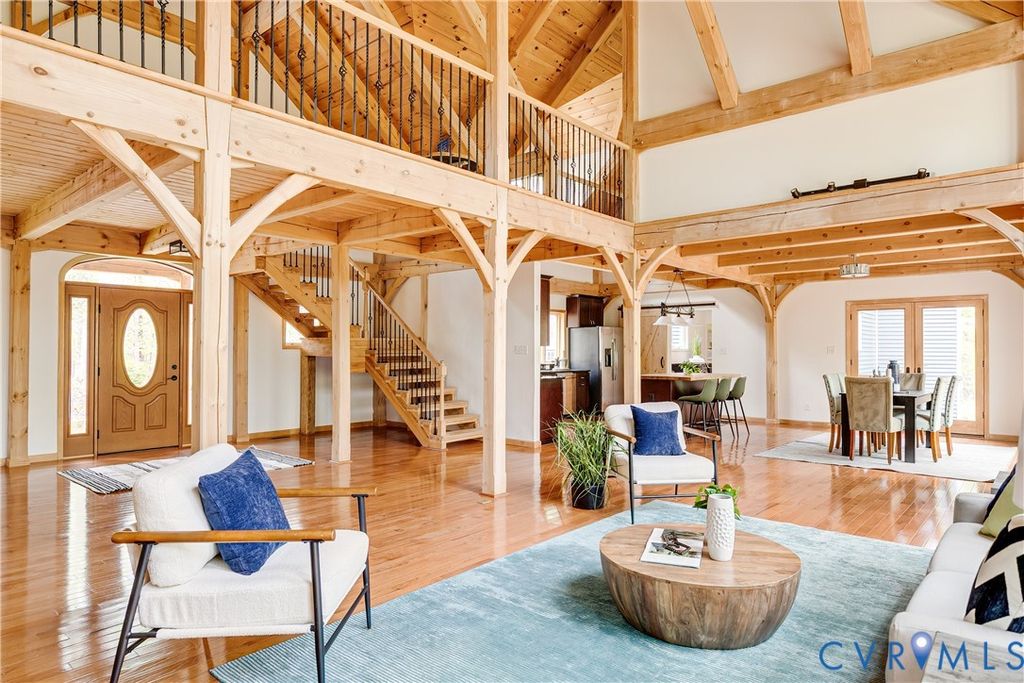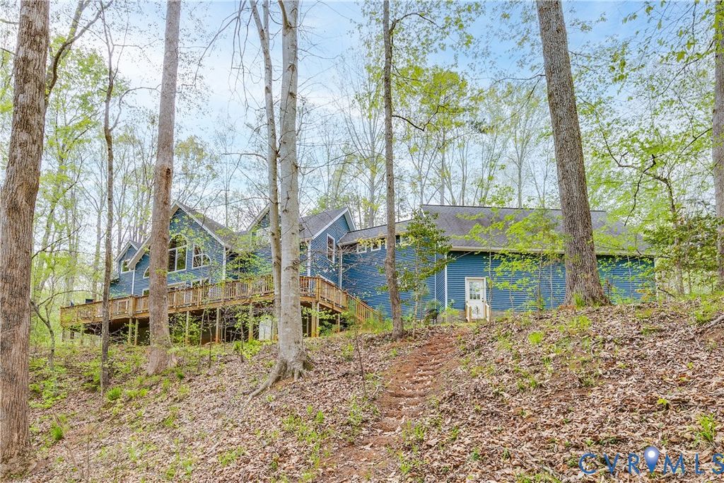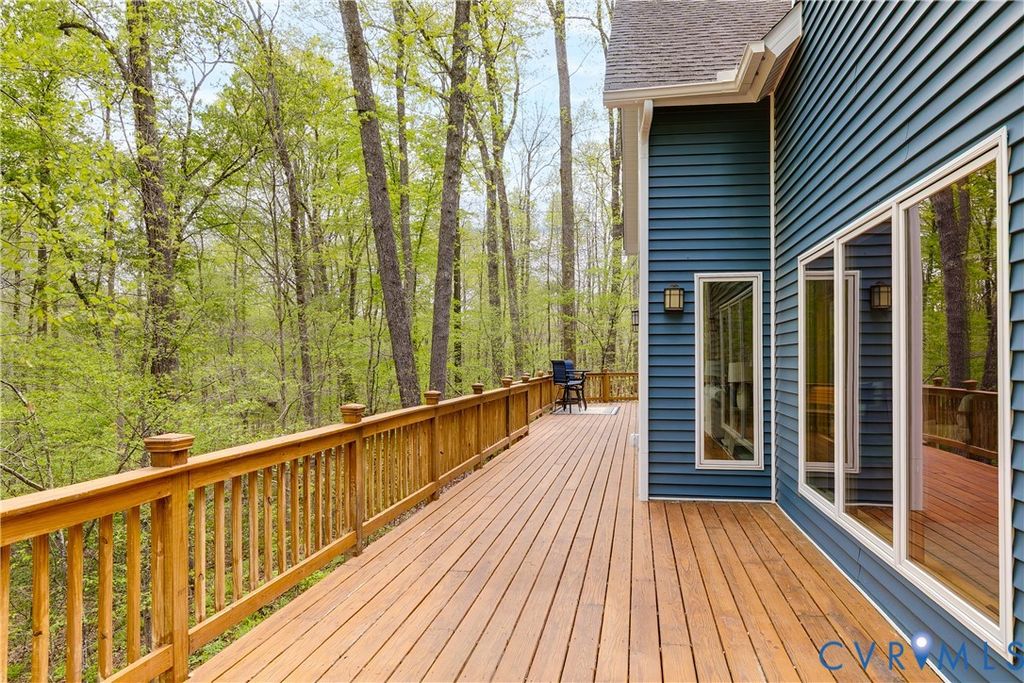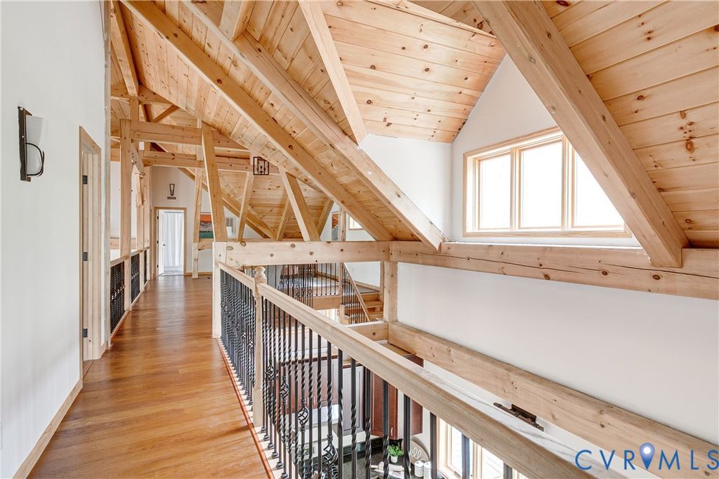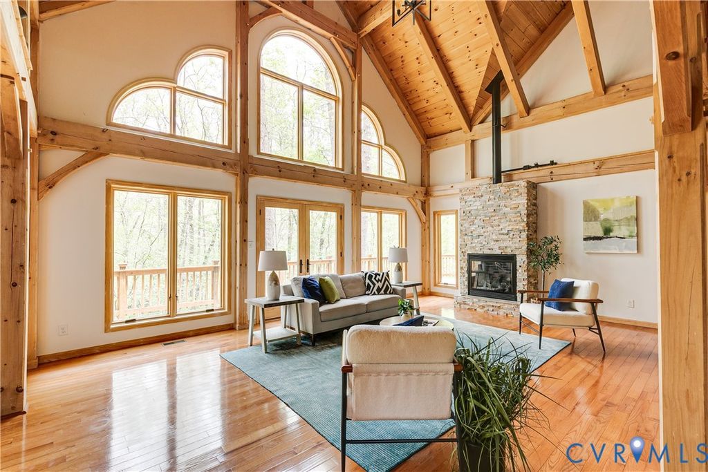 Welcome to your luxurious mountain retreat! This stunning timber-framed home, built by its original owner in 2017, showcases the perfect blend of rustic charm and modern efficiency. Upon entry, you're greeted by soaring natural timber vaulted ceilings and expansive windows that flood the home with natural light. The home is thoughtfully upgraded with Pella Pro-Series windows and doors featuring a triple close/lock system, semi-transparent screens, and exceptional insulation- paired with 6" solid foam walls and ceiling- helping keep energy costs impressively low, even in the height of summer. The first floor offers a spacious primary suite with en-suite bath and French doors leading to the back deck. Just off the living room, the dining area and kitchen are surrounded by windows and offer multiple access points to the deck- perfect for seamless indoor-outdoor entertaining. Adjacent to the kitchen is an oversized laundry room with a walk-in pantry and half bath, conveniently leading to the attached three-car garage. Upstairs, you'll find a cozy loft overlooking the vaulted living space below, along with two additional bedrooms and a full bath. Down the lofted hallway is a flexible bonus space- ideal for an office, closet, or multi-purpose use- which leads to an expansive bonus room that could serve as a fourth bedroom or recreation area. The back deck spans the entire length of the home, creating an ideal space for relaxing or entertaining. Beyond, the open backyard offers plenty of room for playsets and outdoor activities. Don't miss the private hiking trail just off the yard, winding through 10.5 acres complete with a serene creek and abundant wildlife- truly capturing all that Powhatan has to offer.