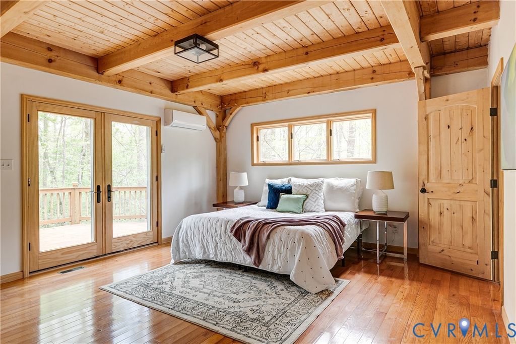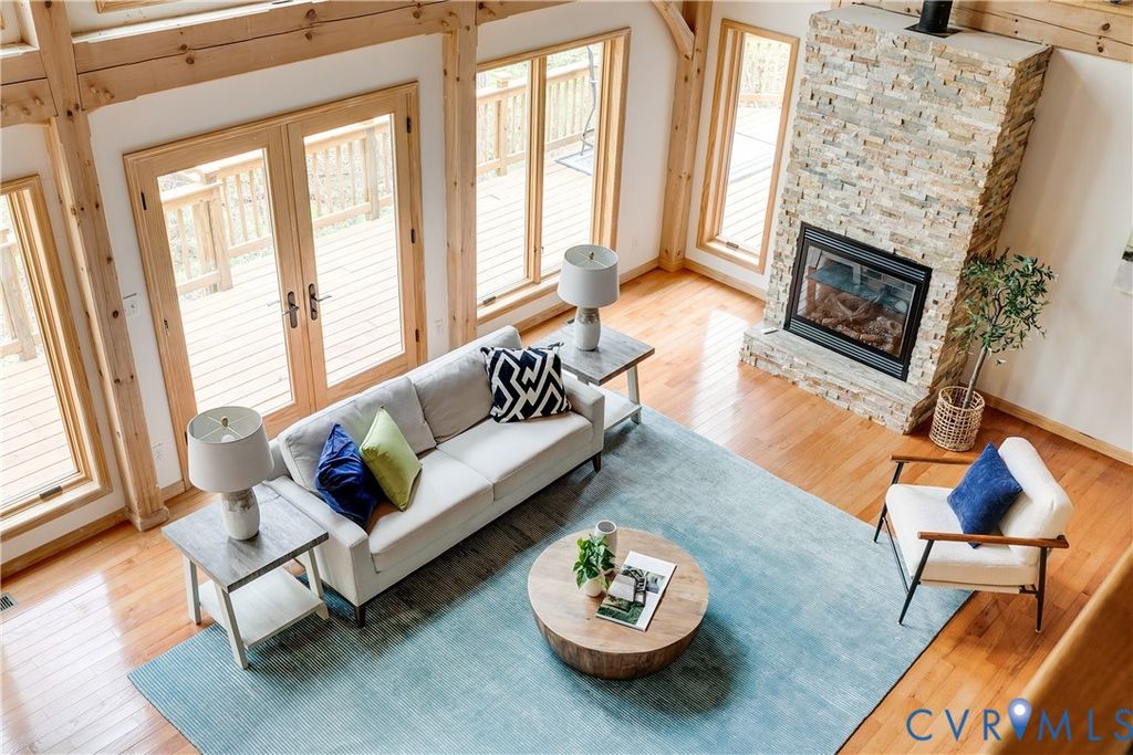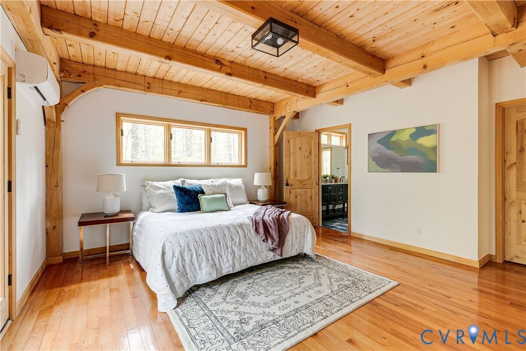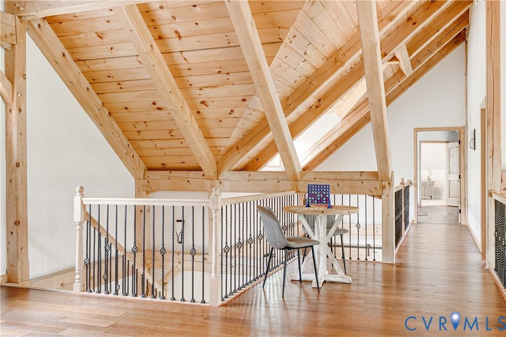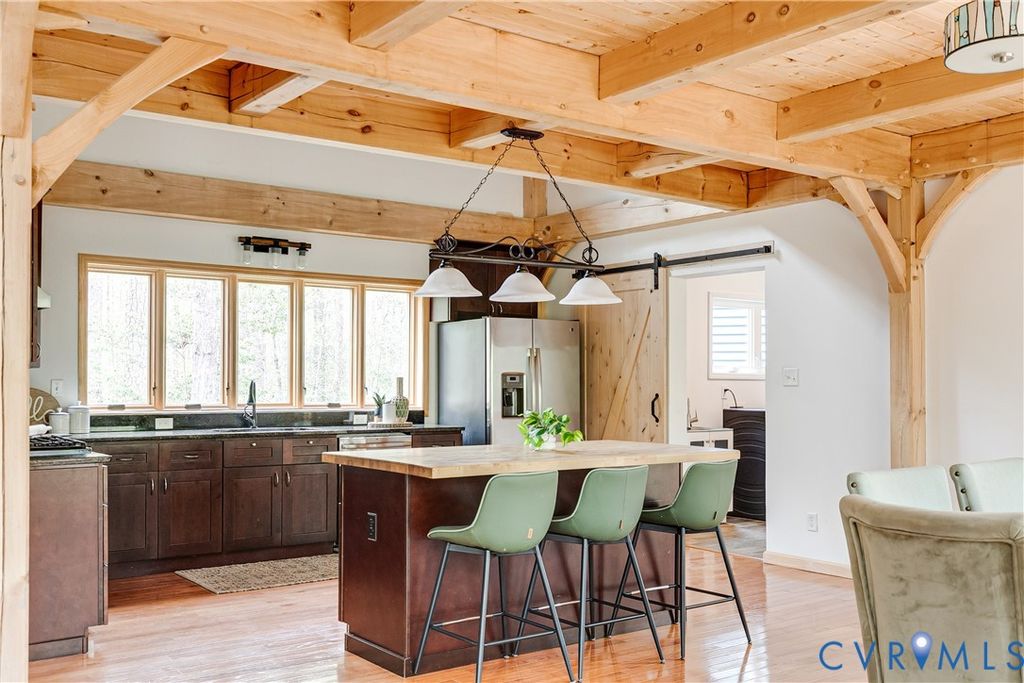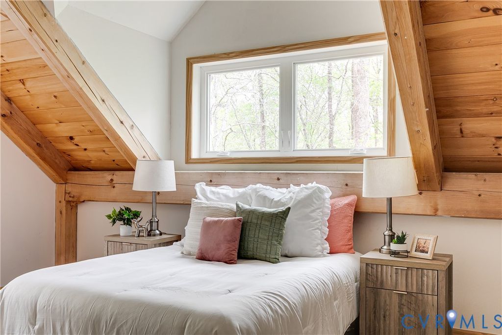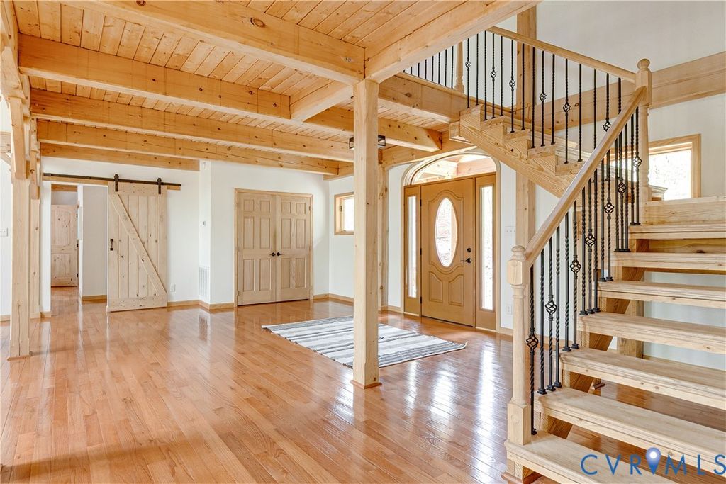 Welcome to your luxurious mountain retreat! This stunning timber-framed home, built by its original owner in 2017, showcases the perfect blend of rustic charm and modern efficiency. Upon entry, you're greeted by soaring natural timber vaulted ceilings and expansive windows that flood the home with natural light. The home is thoughtfully upgraded with Pella Pro-Series windows and doors featuring a triple close/lock system, semi-transparent screens, and exceptional insulation- paired with 6" solid foam walls and ceiling- helping keep energy costs impressively low, even in the height of summer. The first floor offers a spacious primary suite with en-suite bath and French doors leading to the back deck. Just off the living room, the dining area and kitchen are surrounded by windows and offer multiple access points to the deck- perfect for seamless indoor-outdoor entertaining. Adjacent to the kitchen is an oversized laundry room with a walk-in pantry and half bath, conveniently leading to the attached three-car garage. Upstairs, you'll find a cozy loft overlooking the vaulted living space below, along with two additional bedrooms and a full bath. Down the lofted hallway is a flexible bonus space- ideal for an office, closet, or multi-purpose use- which leads to an expansive bonus room that could serve as a fourth bedroom or recreation area. The back deck spans the entire length of the home, creating an ideal space for relaxing or entertaining. Beyond, the open backyard offers plenty of room for playsets and outdoor activities. Don't miss the private hiking trail just off the yard, winding through 10.5 acres complete with a serene creek and abundant wildlife- truly capturing all that Powhatan has to offer.