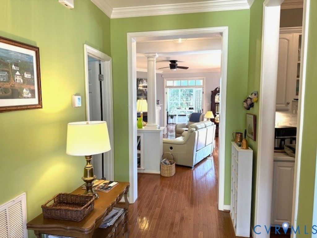Welcome to Brickshire, a beautiful Golfing community! Here we have a home filled with thoughtful upgrades. Gleaming hardwood floors extend from the foyer throughout most of the first floor, while crown molding adds a touch of elegance across the main level. The Kitchen is perfect for both everyday living and entertaining, featuring both a pantry and butler's pantry, solid surface tops, new deep sink, lots of beautiful cabinetry, and opens to a bright morning room with direct access to the deck and aggregate circular patio"”ideal for gatherings. The cozy living room with propane fireplace flows seamlessly into a bright sunroom with a beautiful cathedral ceiling. The first-floor surround sound creates inviting spaces to relax or entertain. The spacious first-floor primary suite offers convenience and comfort, complete with an en suite bath and a huge walk-in closet. A formal dining room with wainscoting and chandelier adds classic style, and having a first-floor laundry enhances everyday ease. Newer oak hardwood treads lead you upstairs to two generously sized bedrooms with closets, and an abundant amount of walk-in storage. Each of the two bedrooms has durable LVT flooring, along with a full bath in between them. Additional highlights include an oversized two-car garage with pedestrian door, electric vehicle outlet, aggregate circular driveway, irrigation system, and a beautifully maintained yard in a peaceful, relaxing neighborhood. One HVAC system was replaced in 2023 with a Bosch system and still has 2 years remaining on the warranty, and the other HVAC system had a new compressor installed in April 2026 -all for added peace of mind. Quality storm doors were added for both comfort and efficiency. Brickshire Community has so much to offer residents! Just some of the amenities include: walking trails, a Playground, clubhouse and Pool, Pickleball and Tennis courts, multiple fishing ponds, and all sorts of club activities.