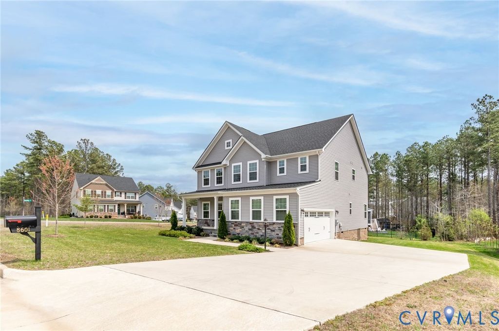 Welcome to 8601 Forge Gate! This spacious craftsman style home is located on a large corner lot in Forge Gate, a luxurious and convenient section of the Harpers Mills community. This home delivers over 3000 sqft of premium living space, dual suites, spacious loft, open layout, attached 2 car+ garage, professional landscaping, irrigation and more. This inviting home welcomes you with its upgraded stone front entry that leads you to the main foyer. Once inside you will be invited into the large formal dining room complete w/ 9+ ceilings, new hardwood floors and tons of natural light. If you continue down the main hall you will be lead into the large chefs kitchen complete with 10ft island w/ luxury features throughout including wall oven, built in microwave, counter depth refrigerator, spacious pantry, full gas oven, granite counters, dishwasher, oversized stainless sink, garbage disposal, subway backsplash, vent hood, & informal spacious dining space. The chefs kitchen connects directly into the main living space creating a perfect great room for everyday use. Off the 1st floor is the 2+ car garage & 1st floor guest suite complete w/ full bath. Once upstairs you will love the large loft space perfect for informal living, playroom or home theater. Off the upstairs you will find 3 additional guest rooms (5 in total), full bath & huge primary suite. The primary suite offers 9+ tray ceilings, 2 large walk in closets and tremendous sqftage for all your furnishings. The primary en-suite offers double vanity, water closet, spacious custom tile shower & more. This Harpers Mill Floorplan is the most desired for a reason w/ every inch carefully planned making the home feel incredibly spacious. Community amenities of Harpers Mill include club house, pool, sports fields and more with private amenities like front/back yard irrigation, alarm system, 10' privacy trees along rear, charming landscaping and more. Schedule your showing of 8601 Forge Gate today!