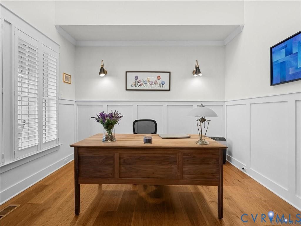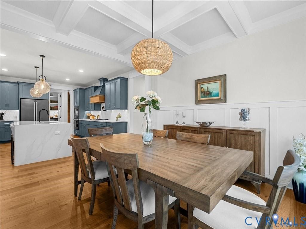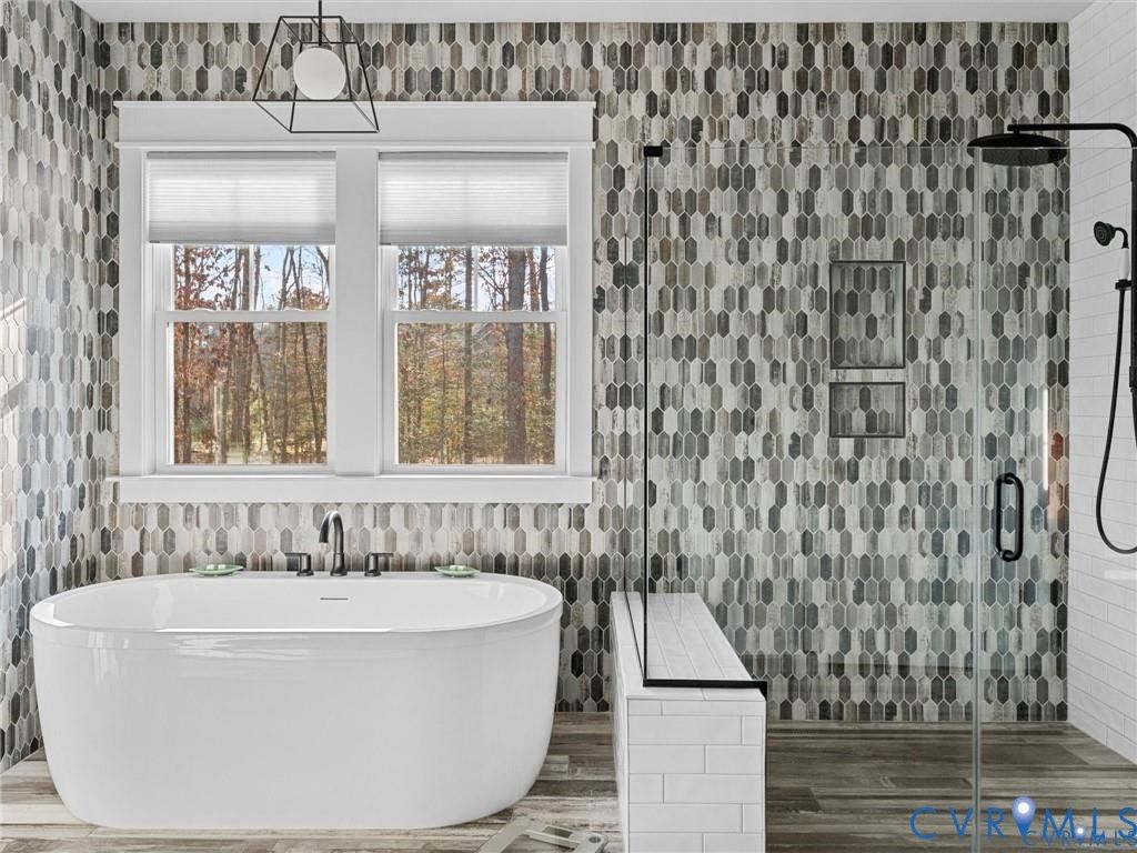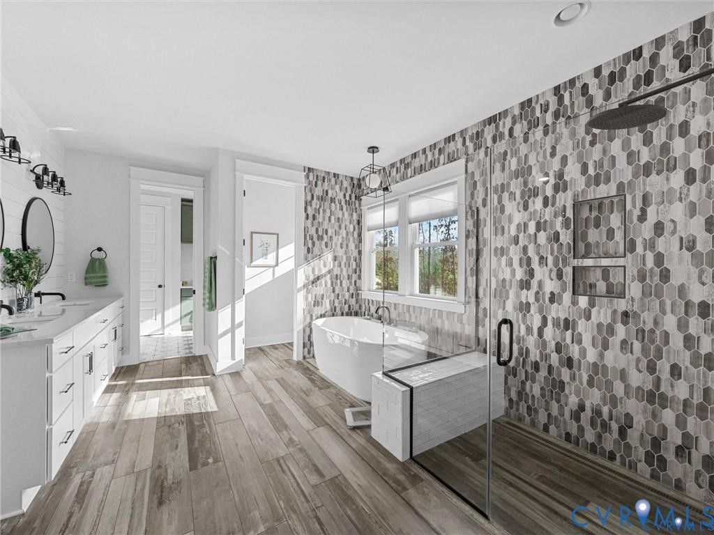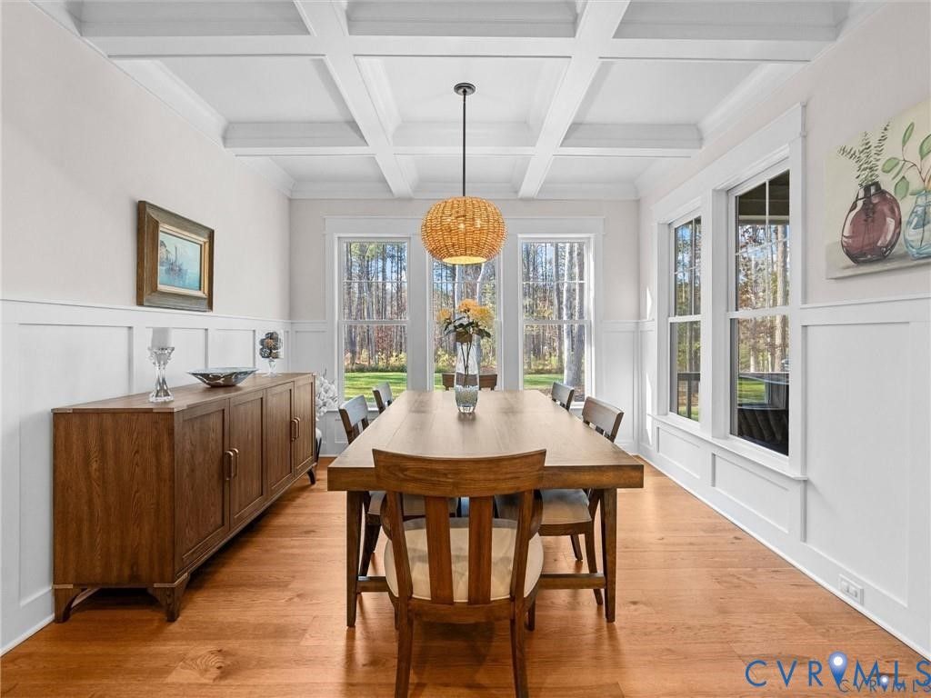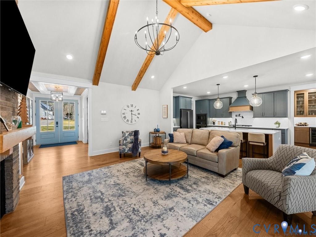 This 2022 Clay Street Builders Parade of Homes award-winning residence blends thoughtful design, craftsmanship, and everyday functionality in the highly sought-after Masters 55+ community in Chesdin Landing A beautifully detailed foyer welcomes you with a coffered, ceiling, wood panel accents, and designer lighting. Just off the entry is a private office featuring 20-foot ceilings, sliding glass barn doors, and hardwood floors that continue throughout the first level. The great room is the centerpiece of the home with vaulted ceilings, exposed wood beams, recessed lighting, and a floor-to-ceiling gas fireplace with custom built-ins, and access to the screened in porch. The kitchen was designed to impress with custom blue cabinetry, waterfall-edge quartz countertops, a large island with deep sink and dishwasher, a 5-burner gas cooktop with pot filler and statement hood, coffee station, walk-in pantry, and a wet bar with wine cooler. The adjoining morning room features decorative wall trim, and a wall of windows bringing in natural light. The first-floor primary suite offers vaulted ceilings with exposed beams, hardwood floors, and backyard views. The ensuite bath includes dual vanities with quartz counters, a soaking tub, oversized glass walk-in shower with rainfall head, private water closet, and a spacious walk-in closet that conveniently connects to the laundry room with custom cabinetry, tile backsplash, utility sink, and additional storage. Two additional bedrooms on the main level share a hall bath with double vanity and hexagon tile flooring. A drop zone with built-in cubbies, half bath, and access to the two-car garage adds everyday convenience. Upstairs, a fourth bedroom or bonus suite with full bath provides flexible space for guests or recreation. Outdoor living continues with a 17' x 12' screened porch with, steps down to a stone patio. Additional highlights include a two-zone HVAC system, irrigation system, alarm system, and easy access to the community's golf, lake, and clubhouse amenities.