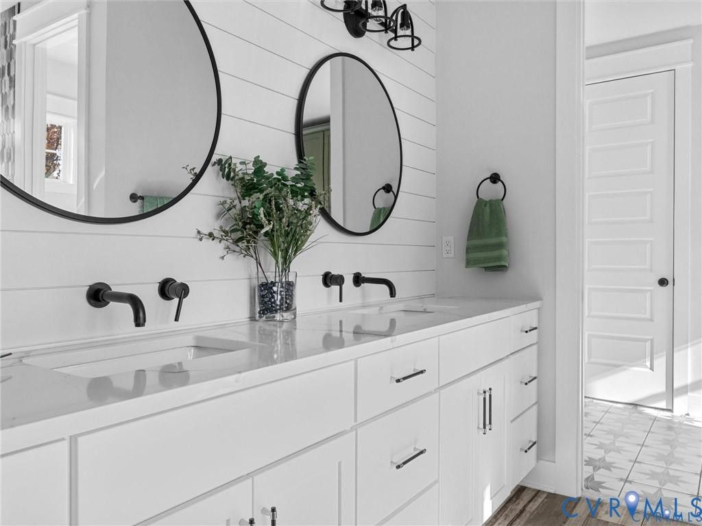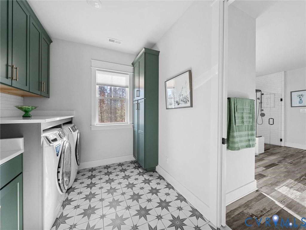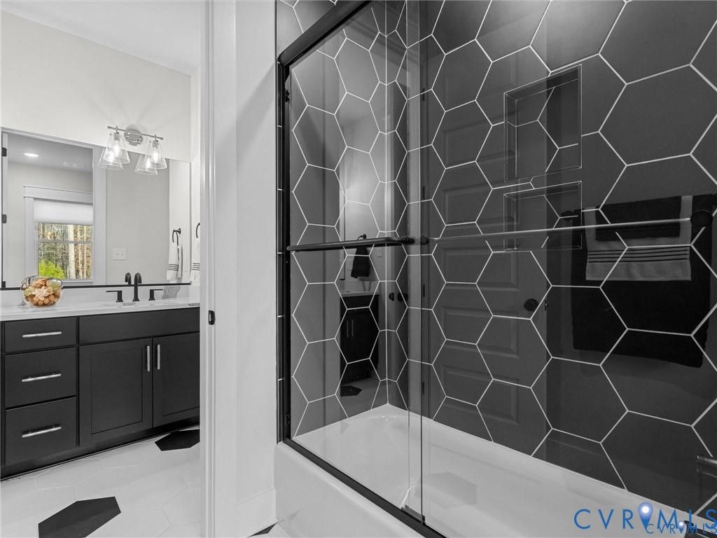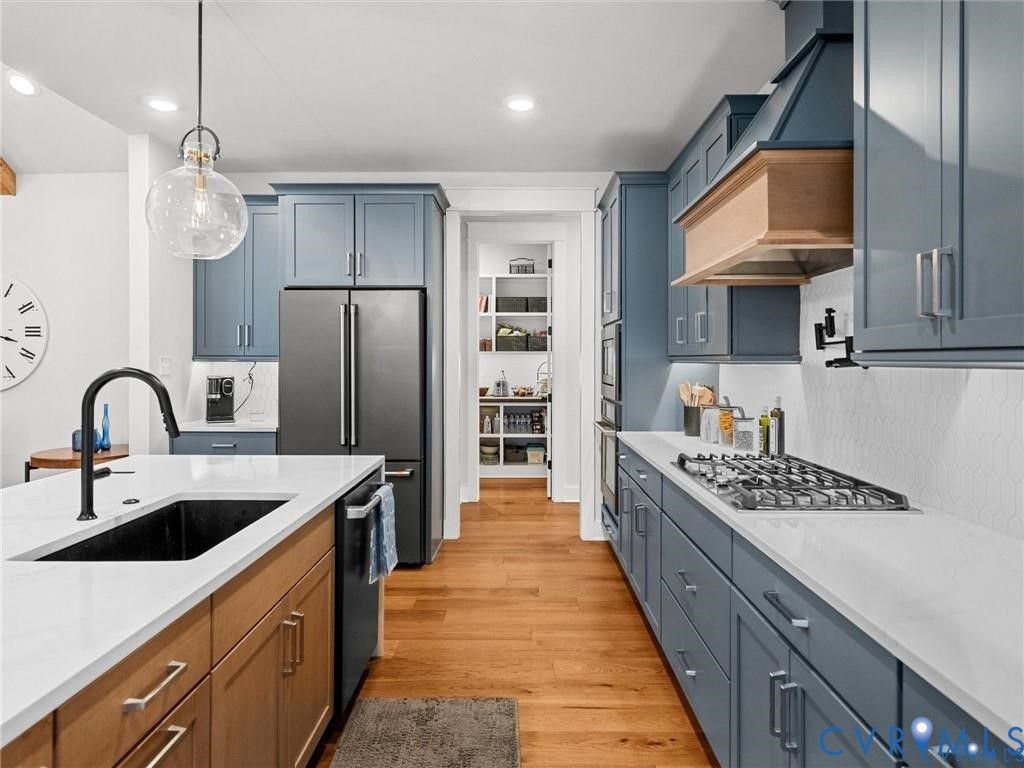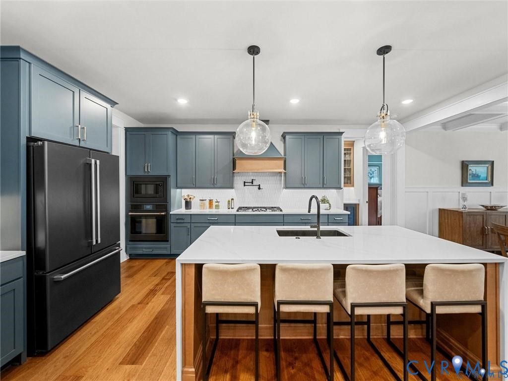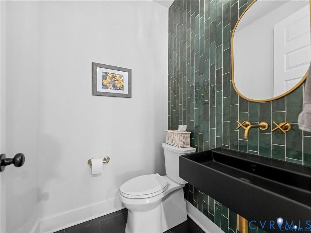 This 2022 Clay Street Builders Parade of Homes award-winning residence blends thoughtful design, craftsmanship, and everyday functionality in the highly sought-after Masters 55+ community in Chesdin Landing A beautifully detailed foyer welcomes you with a coffered, ceiling, wood panel accents, and designer lighting. Just off the entry is a private office featuring 20-foot ceilings, sliding glass barn doors, and hardwood floors that continue throughout the first level. The great room is the centerpiece of the home with vaulted ceilings, exposed wood beams, recessed lighting, and a floor-to-ceiling gas fireplace with custom built-ins, and access to the screened in porch. The kitchen was designed to impress with custom blue cabinetry, waterfall-edge quartz countertops, a large island with deep sink and dishwasher, a 5-burner gas cooktop with pot filler and statement hood, coffee station, walk-in pantry, and a wet bar with wine cooler. The adjoining morning room features decorative wall trim, and a wall of windows bringing in natural light. The first-floor primary suite offers vaulted ceilings with exposed beams, hardwood floors, and backyard views. The ensuite bath includes dual vanities with quartz counters, a soaking tub, oversized glass walk-in shower with rainfall head, private water closet, and a spacious walk-in closet that conveniently connects to the laundry room with custom cabinetry, tile backsplash, utility sink, and additional storage. Two additional bedrooms on the main level share a hall bath with double vanity and hexagon tile flooring. A drop zone with built-in cubbies, half bath, and access to the two-car garage adds everyday convenience. Upstairs, a fourth bedroom or bonus suite with full bath provides flexible space for guests or recreation. Outdoor living continues with a 17' x 12' screened porch with, steps down to a stone patio. Additional highlights include a two-zone HVAC system, irrigation system, alarm system, and easy access to the community's golf, lake, and clubhouse amenities.