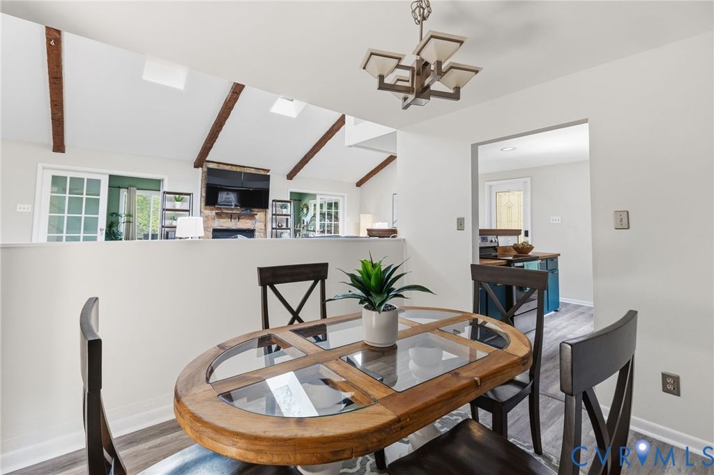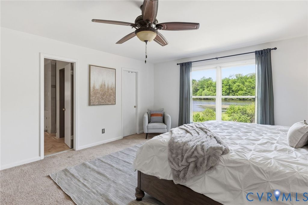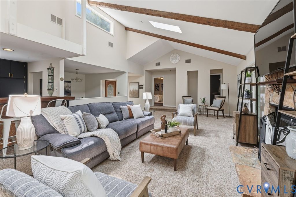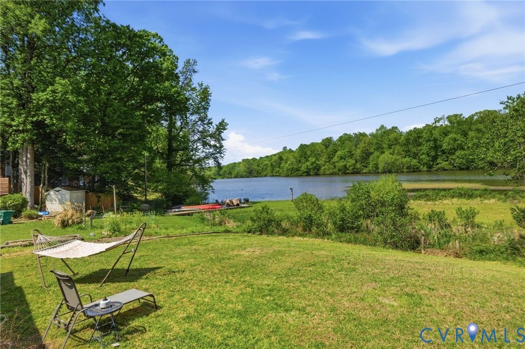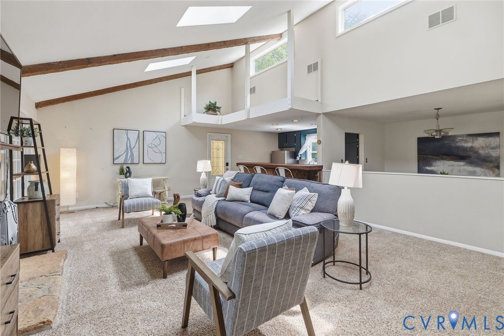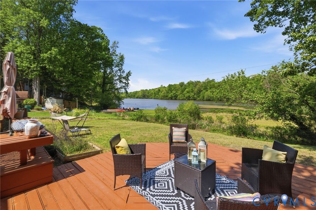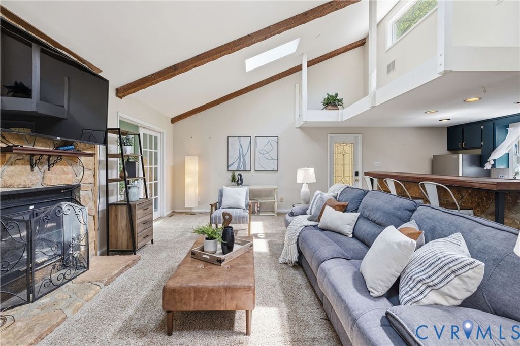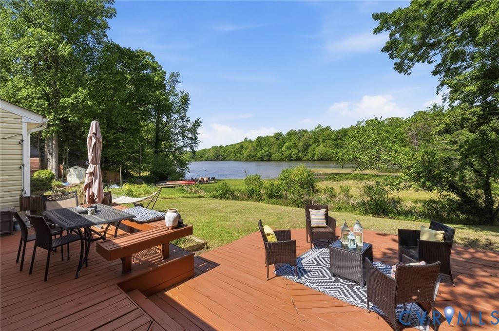 WATERFRONT, half acre lot in Bon Air! Contemporary modern with amazing views of private community lake. Low maintenance vinyl siding, efficient replacement windows, roof 7 yrs old. Inside boasts stunning beamed vaulted ceilings with stone fireplace in the expansive living room. Gorgeous sunroom with sliding doors to the oversized rear deck, a great place to sip coffee with fantastic lake views! Rear deck had a hot tub that has been removed, electrical hook up is underneath if purchaser would like to add a hot tub in the future. Great galley style kitchen with butcher block countertops, tile backsplash and stainless appliances. Bedroom 1 is spacious with private full bath and great closet. Laundry is convenient to bedrooms. Hall powder room. The primary bedroom is generously sized with huge picture window facing the lake, 2 walk in closets and spa-like bath with large tub, tiled shower and double sinks. Breezeway to garage, ample parking in driveway and hardscape/landscaped front yard. The community has an optional civic association that covers the common areas and insurance for the lake. Great location close to shopping, dining, and interstates.