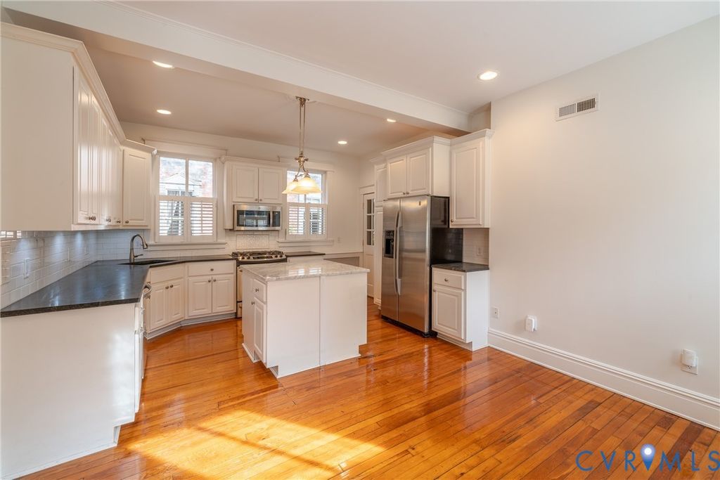 This spectacular renovated 1915 Greek Revival home seamlessly blends timeless architectural charm with modern luxury in the heart of the Museum District"”just a short walk to Carytown, the Fan, and the Virginia Museum of Fine Arts. A gracious, sun-filled foyer welcomes you into elegant formal living and dining rooms rich with natural light. Architectural details abound, including stately columns, exquisite moldings, and a handsome gas fireplace flanked by custom built-in bookshelves. The spacious dining room offers flexibility and showcases a built-in wine or china cabinet. The thoughtfully updated kitchen features soapstone and marble countertops, stainless steel appliances, and opens to a spacious family room with custom built-ins"”ideal for everyday living and entertaining. A stylish half bath and pantry complete the first floor. Upstairs, the expansive primary suite offers a sitting area, large walk-in closet, ensuite bath, and private balcony. Two additional generously sized bedrooms provide flexibility, including the option for a second primary with direct access to the hall bath. A dedicated laundry area adds convenience. Outdoor living is exceptional, with a charming front porch, rear deck, and rare oversized front and rear yards"”an uncommon find in this location. Additional highlights include a detached one-and-a-half-car garage, off-street parking, and a bonus ground-level storage/utility room. Fully detached and move-in ready, this home lives larger than its square footage and offers the best of city living.